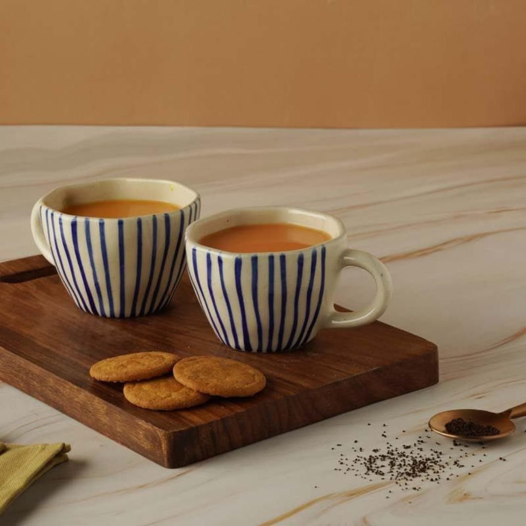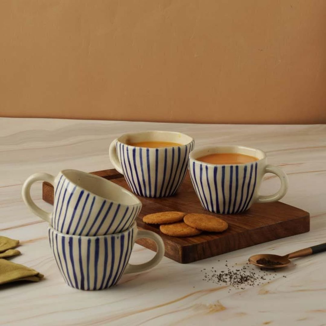 Enjoy your favorite tea or coffee in style with this elegant set of handcrafted ceramic cups. Featuring a minimalist design with hand-painted vertical blue stripes on a white base, these cups bring a touch of sophistication to your table. Perfectly sized for everyday use, they’re durable, microwave-safe, and easy to clean. Whether you’re hosting guests or enjoying a quiet moment with cookies and chai, this set of four cups is a timeless addition to your kitchenware collection.
