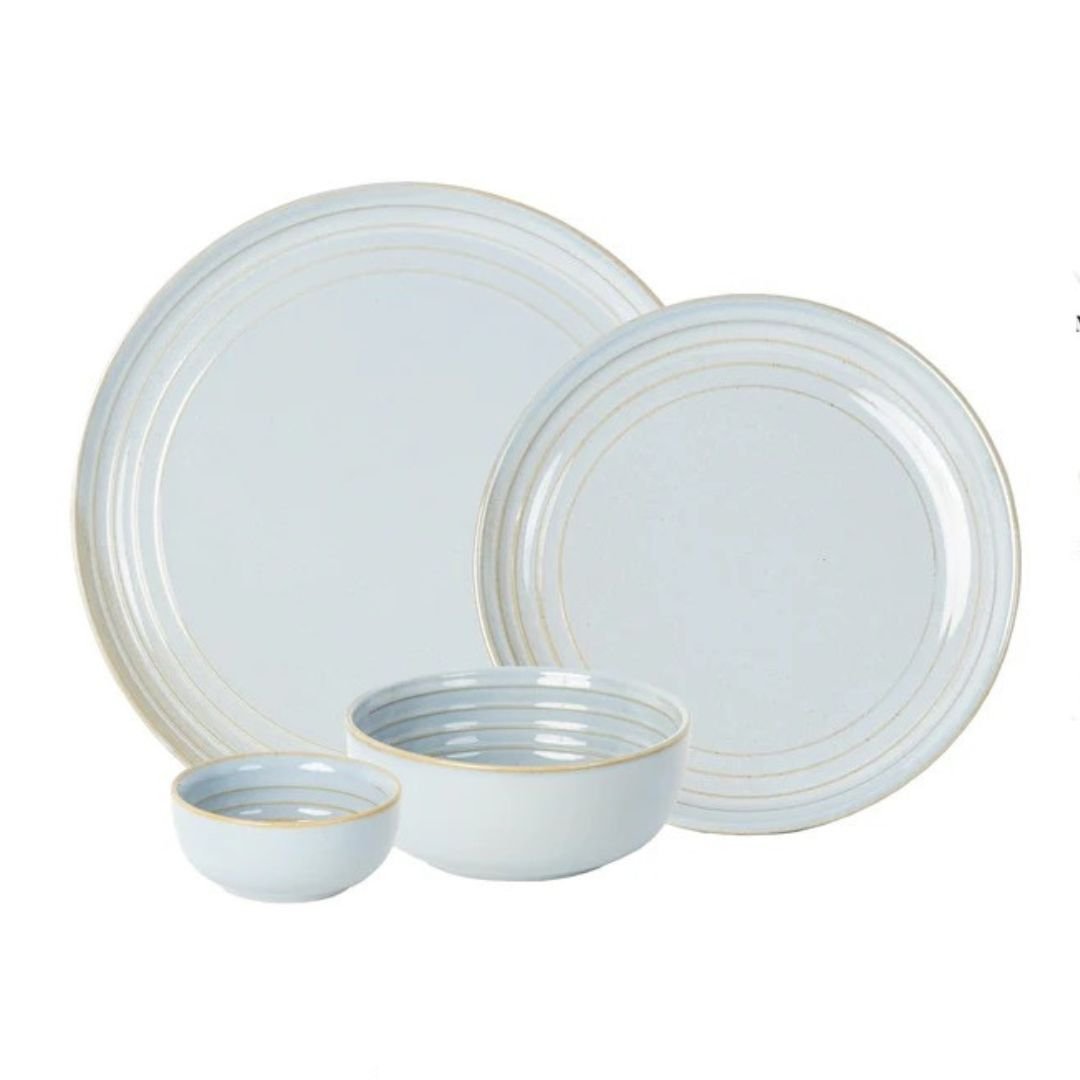 Pair this serene blue-grey dinnerware with neutral linen napkins and brushed gold cutlery to enhance its elegant rim detailing. For a modern yet inviting tablescape, add a simple eucalyptus garland or white florals in a stone or ceramic vase. The soft color palette works beautifully in both minimal and contemporary settings—perfect for elevating everyday dining or impressing at dinner parties.