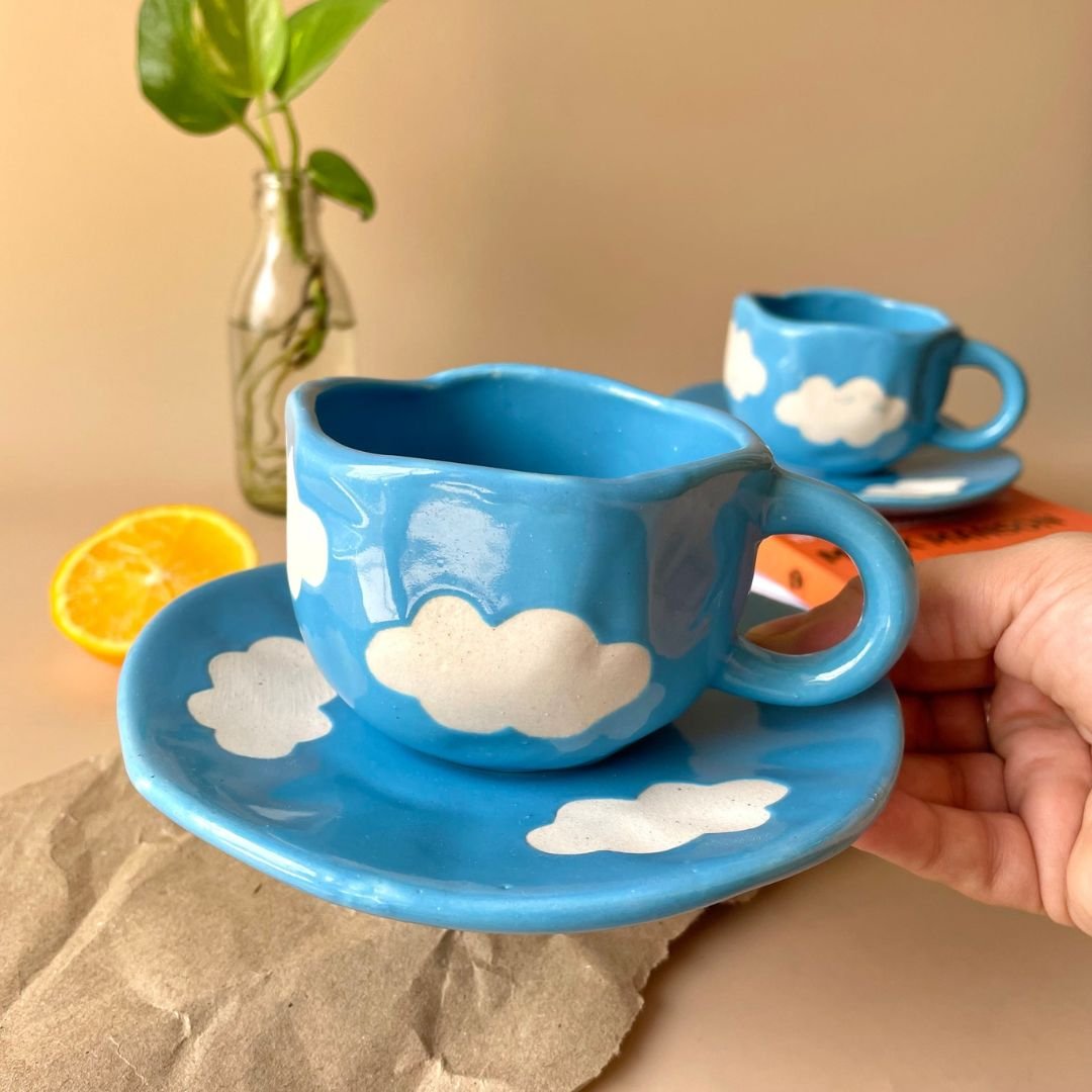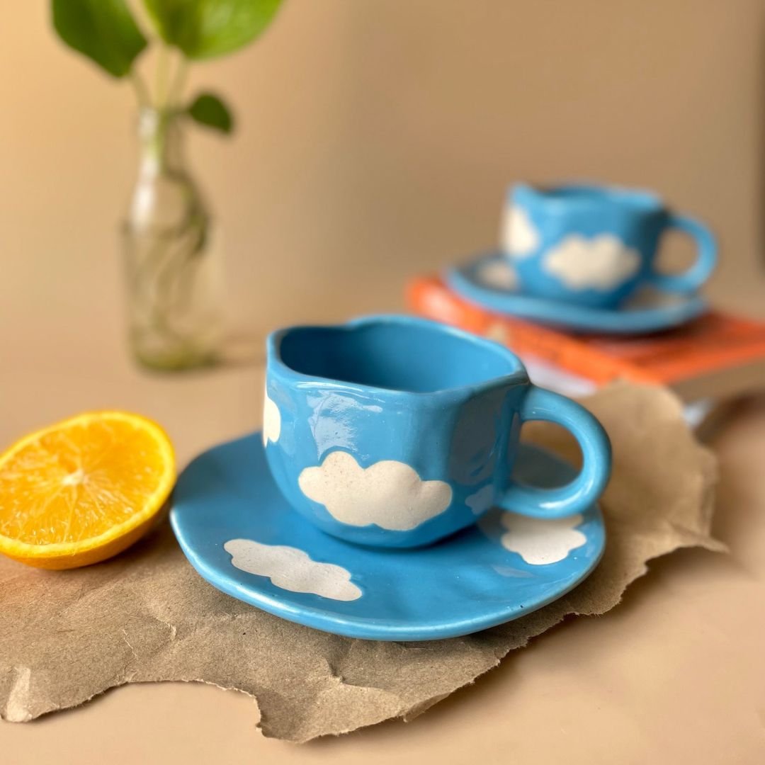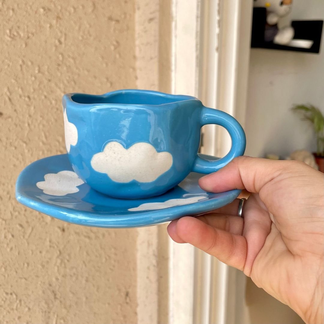 Sip your favorite brew with the Cloud Sip Mug. Handcrafted in a vibrant sky-blue glaze and adorned with fluffy white clouds, this whimsical cup brings a touch of joy to your everyday routine. Its organic, wavy rim and rounded form add character, while the sturdy handle ensures comfort with every sip. Perfect for coffee, tea, or hot chocolate, this mug is a little piece of sunshine for dreamers and cloud-watchers alike.