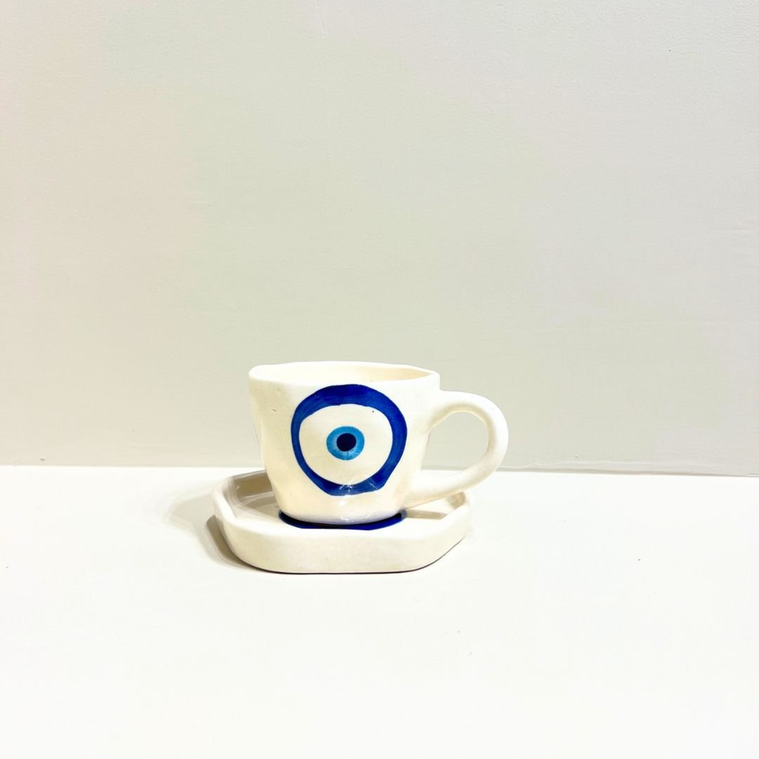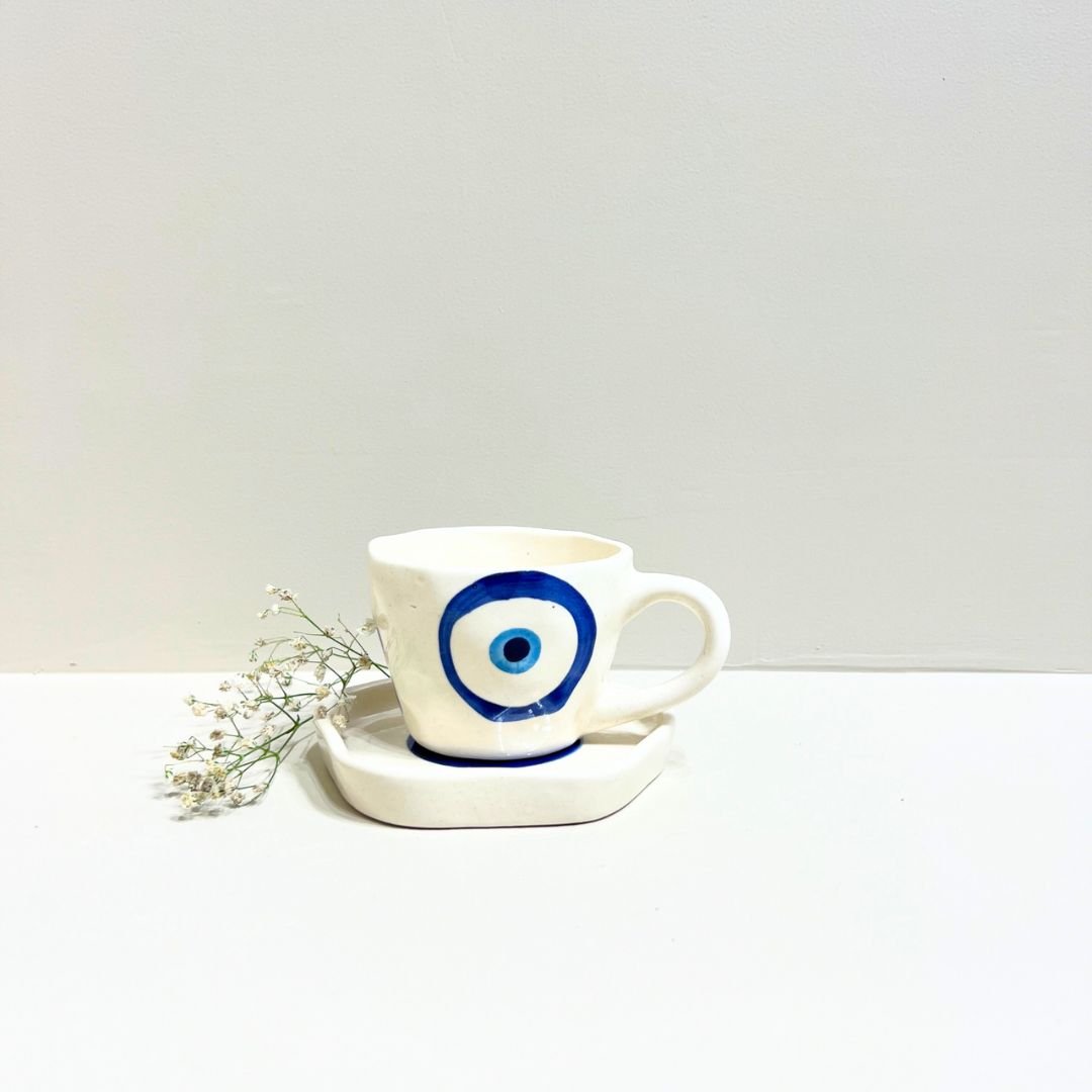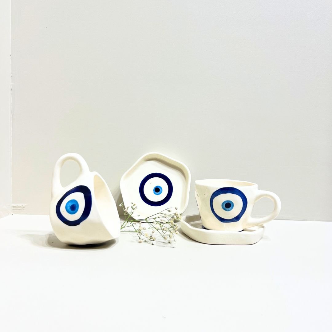 Add a touch of protection and artistry to your tableware with the Evil Eye Aura Set. Handcrafted with an elegant ivory base, each piece is adorned with the iconic Evil Eye design — a symbol believed to ward off negativity and invite good energy. Perfect for serving coffee, tea, or simply elevating your décor, this set blends modern minimalism with timeless tradition. Durable, functional, and eye-catching, it’s more than just tableware — it’s a statement of style and positivity.