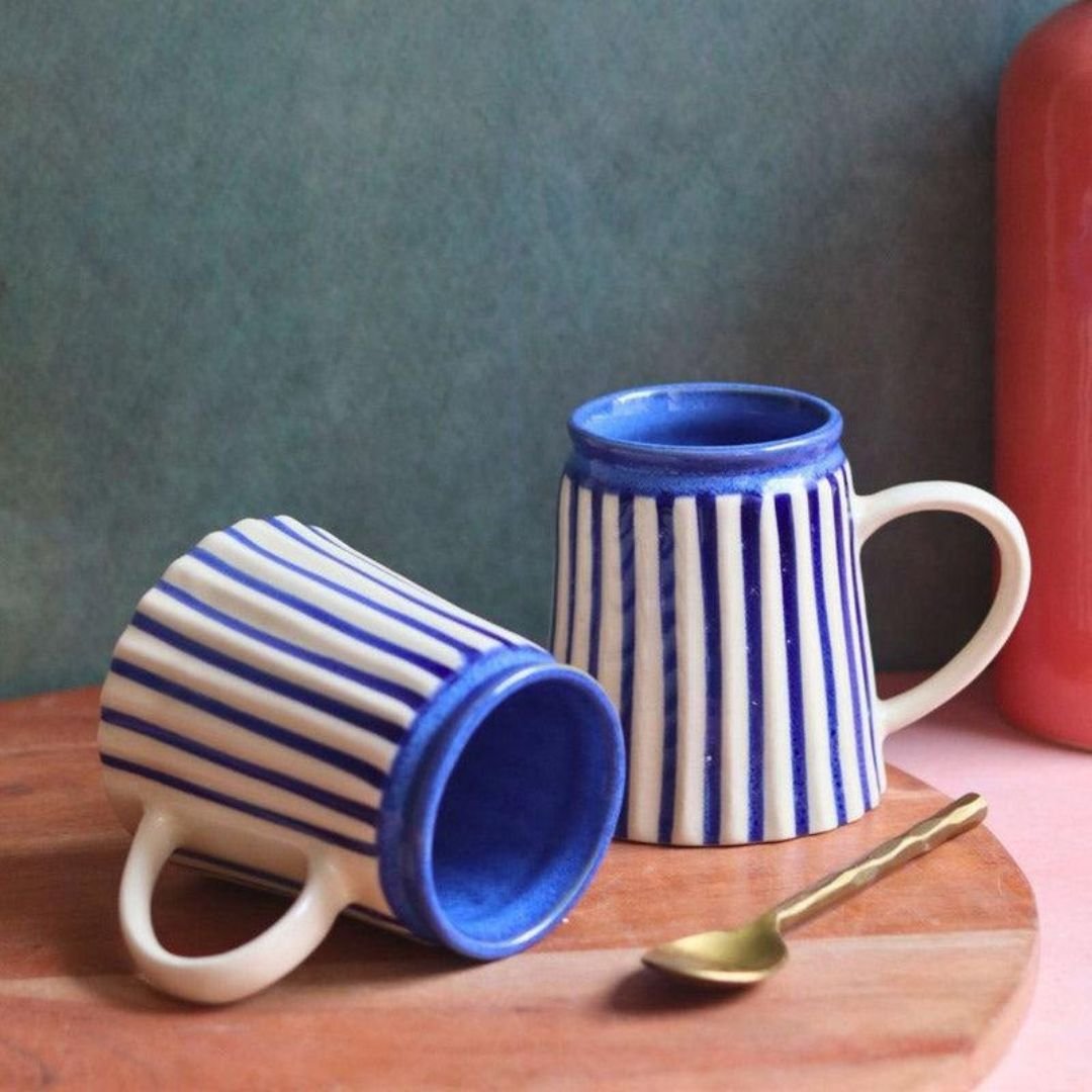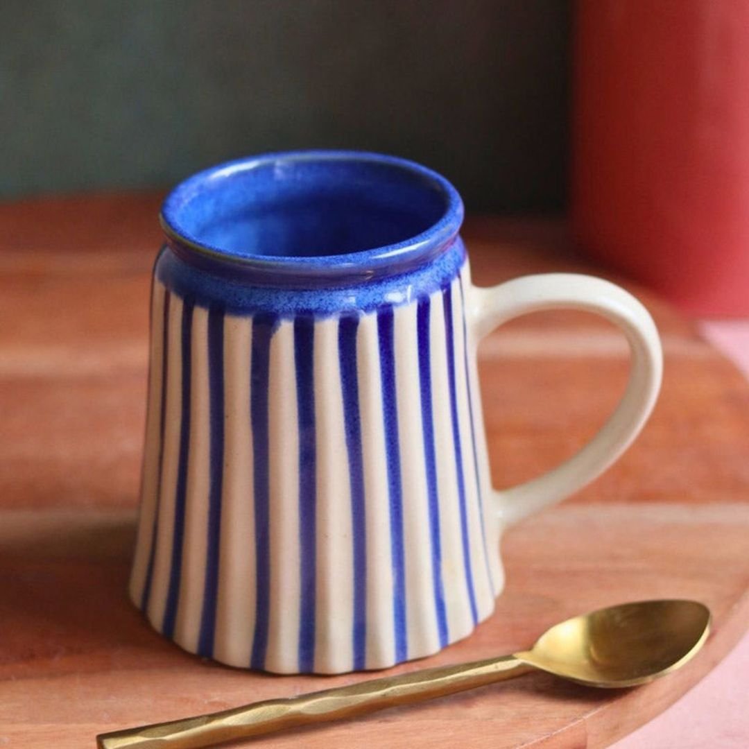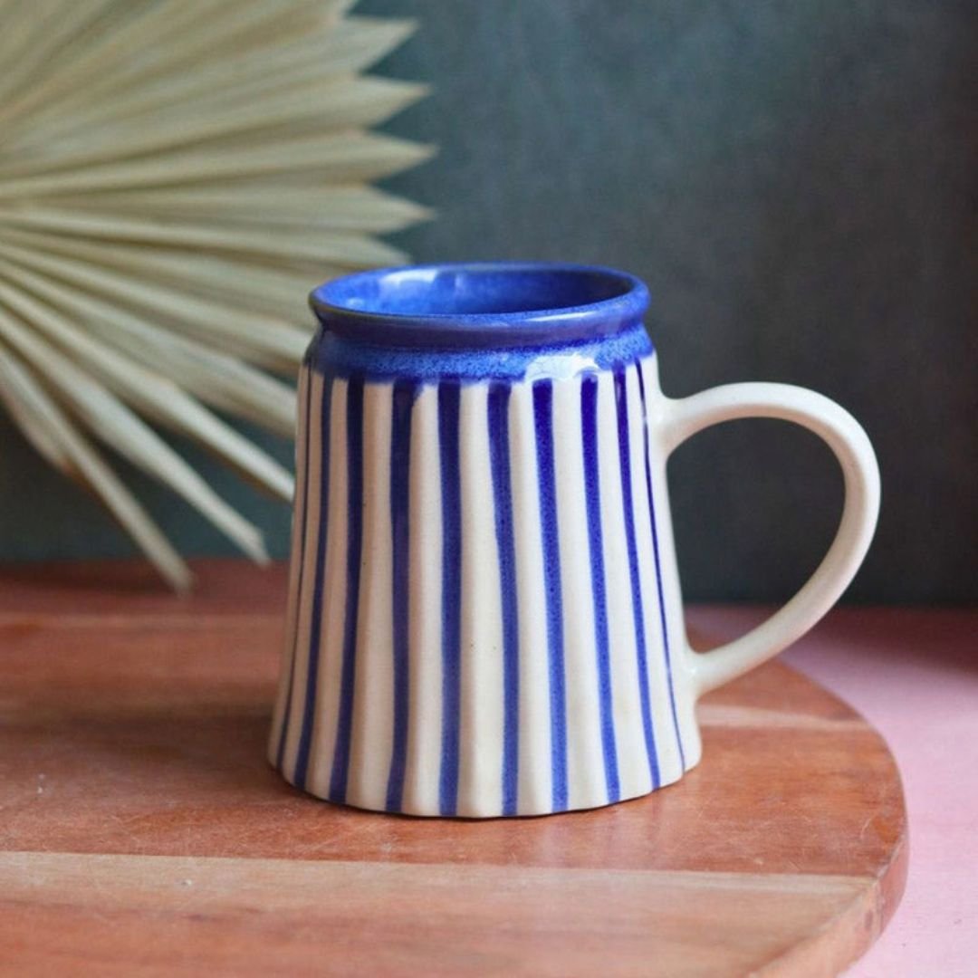 Bring a touch of artisanal charm to your beverage time with this handcrafted ceramic mug featuring hand-painted indigo vertical stripes. Its elegant flared shape and sturdy handle offer both style and comfort, making it perfect for enjoying your morning coffee, evening tea, or any hot beverage. The bold blue-and-cream contrast adds a modern yet timeless aesthetic, making it a versatile addition to your kitchenware collection or a thoughtful gift for a loved one.