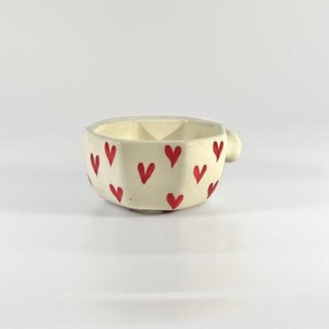 Bring a little sweetness to every bite with this playful ceramic snack bowl. Decorated with scattered red hearts on a soft cream background, it’s a fun and cheerful piece that brightens any table. Perfect for serving nuts, candies, sauces, or small treats, this bowl adds a pop of charm to casual meals, parties, or cozy nights in. Lightweight yet sturdy, it’s a delightful addition to any kitchen collection.