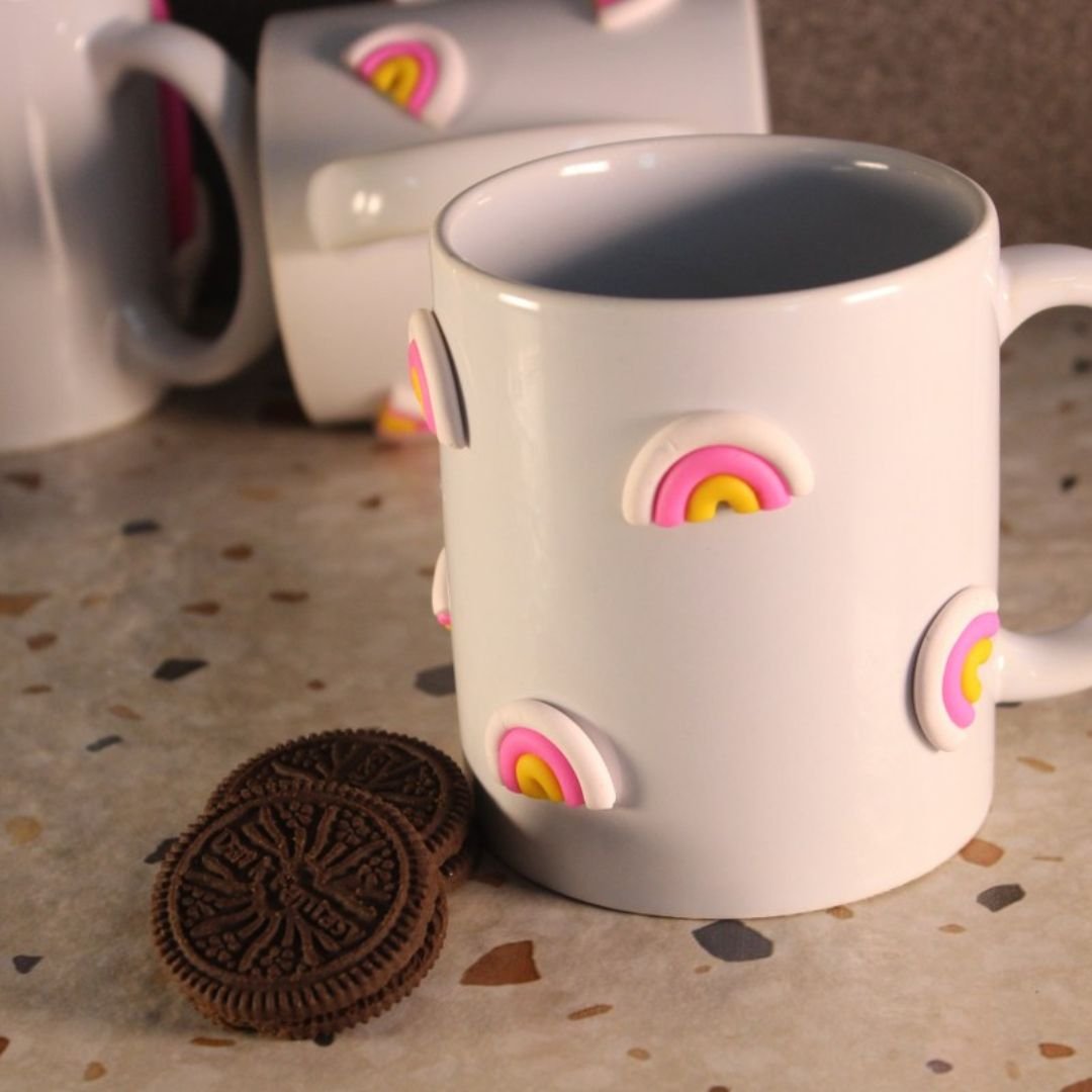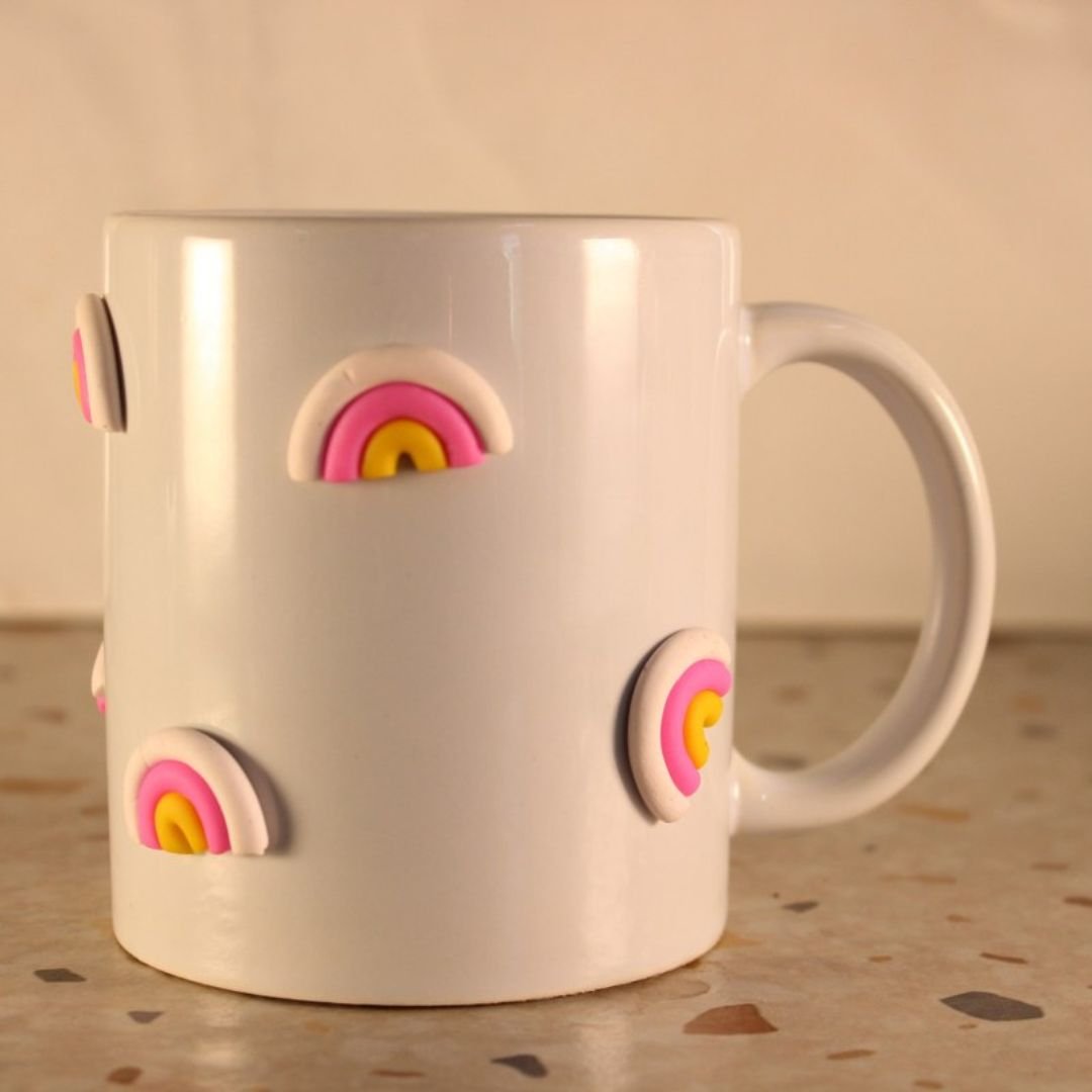 Brighten your mornings with this playful ceramic mug, featuring raised pastel rainbow motifs in pink, yellow, and white. The clean white base makes the colors pop, adding a fun and cheerful vibe to your coffee or tea time. Handcrafted with care, this mug combines functionality with a touch of whimsy—perfect for gifting or adding a splash of joy to your daily routine.