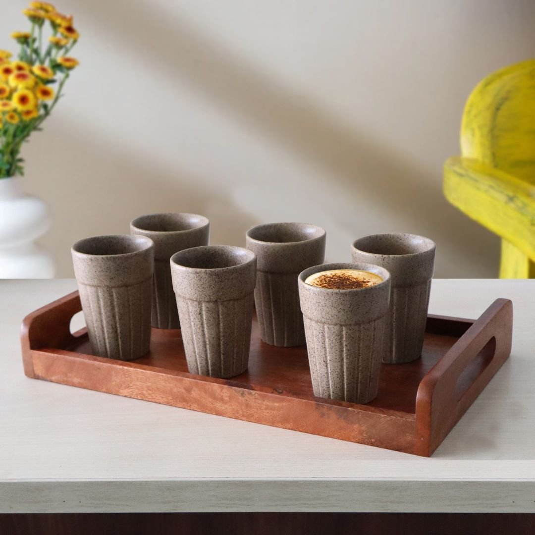 Pair these earthy-toned ceramic chai glasses with a natural jute tray or wooden serving board for a warm, organic tea setup. Add a sprig of dried flowers or a palm leaf for a touch of minimal elegance that enhances the rustic charm of the set. Perfect for cozy evening chai moments or relaxed weekend brunches.