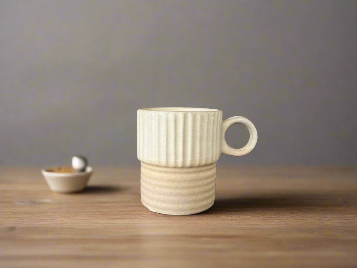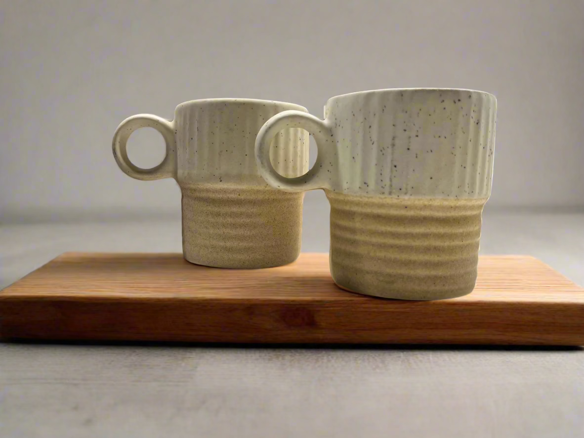 Elevate your coffee or tea ritual with this beautifully crafted set of rustic stoneware mugs. Featuring a two-tone design with a natural sand-colored base and a speckled ivory top, these mugs embody modern minimalism with a warm, earthy touch. The ribbed texture adds depth and character, while the sturdy handles ensure a comfortable grip. Perfect for slow mornings, cozy evenings, or as a thoughtful gift, this set blends timeless style with everyday functionality.