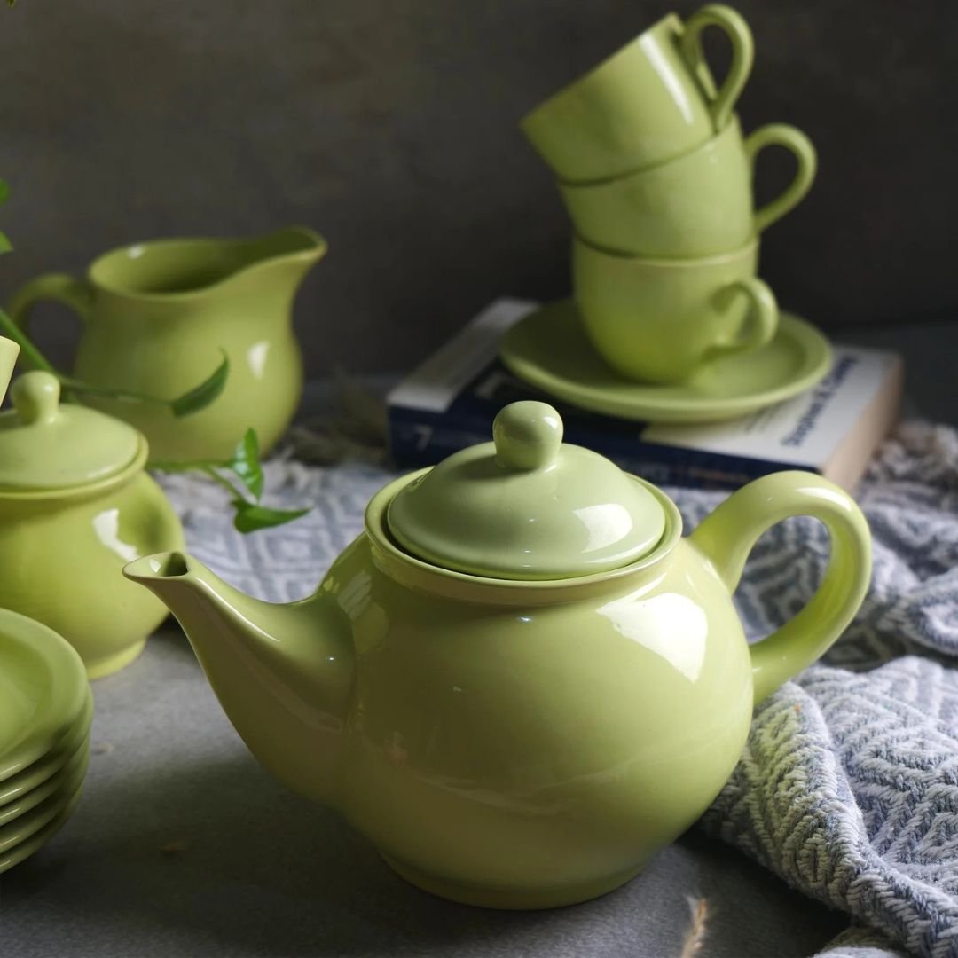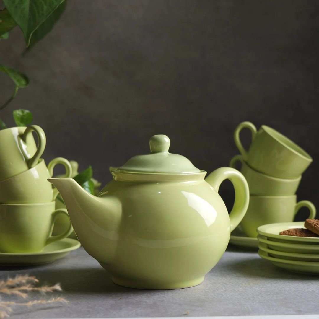 Brew in style with this charming green ceramic teapot set — a timeless addition to your tea ritual. Finished in a soft glossy glaze, this handcrafted teapot brings a fresh and calming touch to any kitchen or table setting. The smooth contours and classic round shape make pouring effortless, while the snug-fit lid and sturdy handle ensure functionality meets elegance.