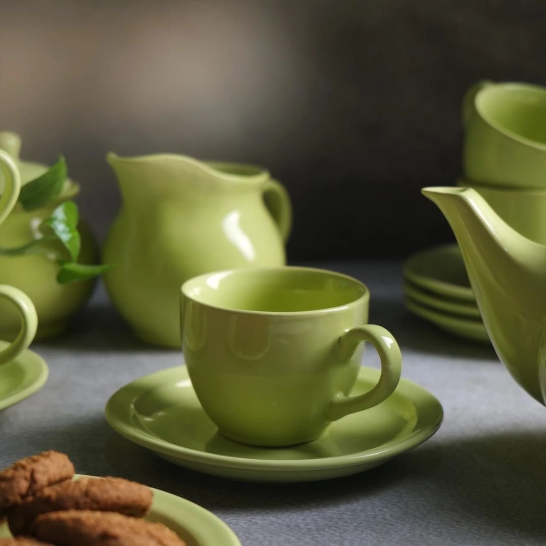 This elegant set includes six finely crafted cups with matching saucers, a gracefully shaped teapot, a sleek milk jug, and a chic sugar pot. With its radiant green hue and glossy finish, the Saga Bloom Tea Set adds a sophisticated touch to any gathering. Whether you’re entertaining guests, marking a special occasion, or savoring a quiet tea moment, this set beautifully blends functionality, craftsmanship, and timeless style.