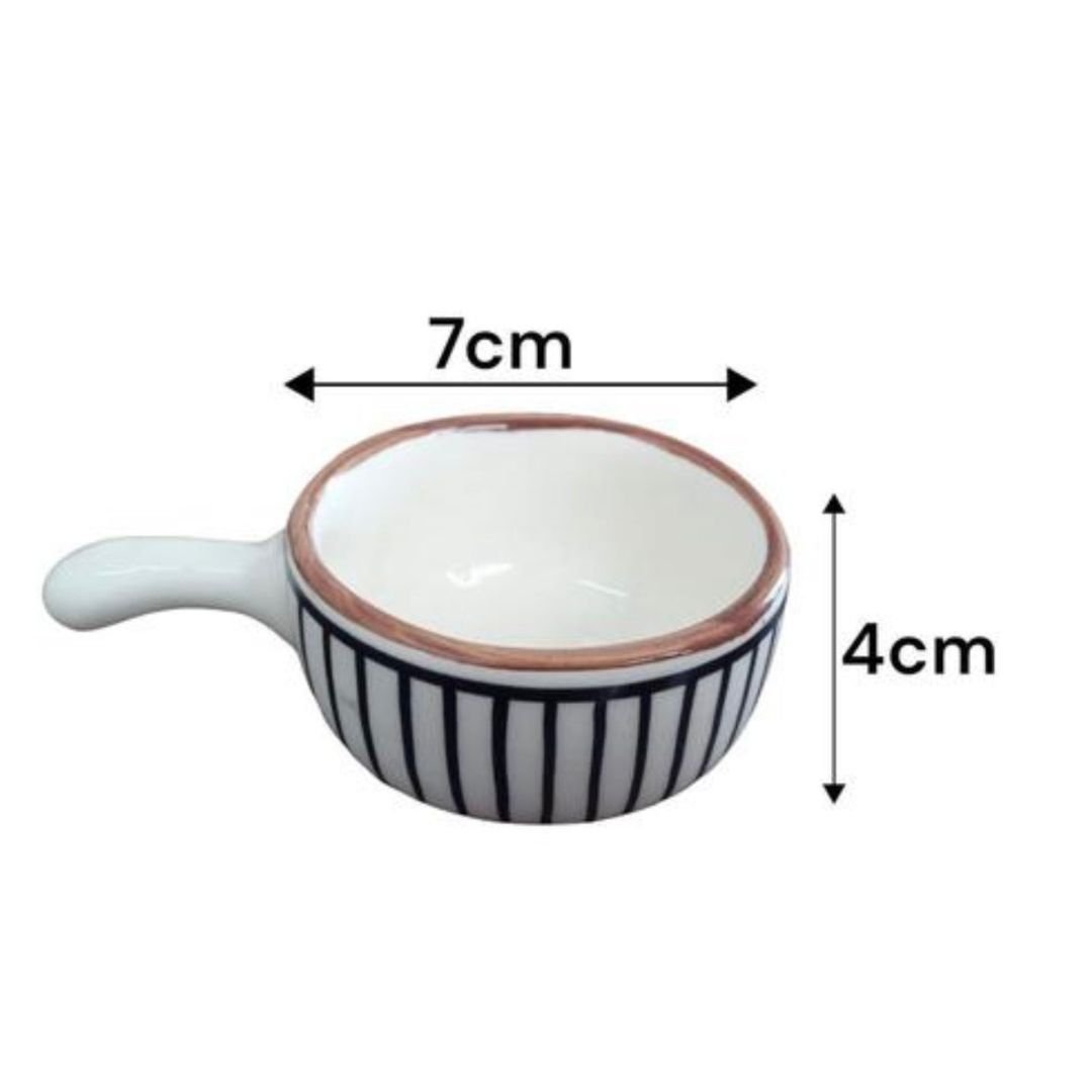 Serve your favorite chutneys, sauces, or dips in style with this set of handcrafted ceramic dip bowls. Featuring a sleek vertical stripe design in deep navy against a cream base, accented with a rustic brown rim, these bowls combine modern aesthetics with artisanal charm. The elongated handle adds both functionality and a unique touch, making them perfect for entertaining guests or elevating everyday dining. Durable and versatile, they are ideal for dips, condiments, or even small snacks.
