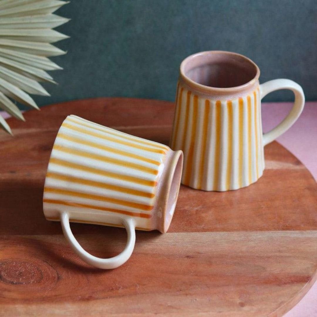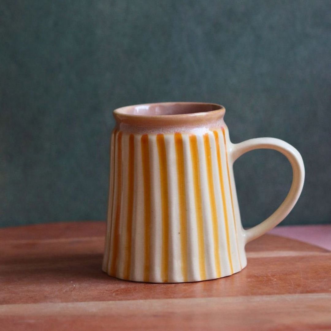 Sip your favorite brew in style with this handcrafted ceramic mug, featuring warm brown and golden vertical stripes inspired by sunset hues. Its flared design and sturdy handle ensure a comfortable grip, while the earthy tones bring a rustic yet contemporary touch to your drinkware collection. Perfect for coffee, tea, or hot chocolate, this artisanal piece adds both charm and functionality to your everyday routine.
