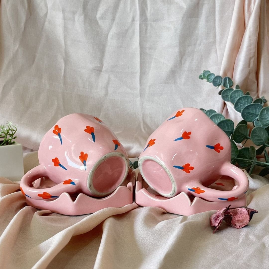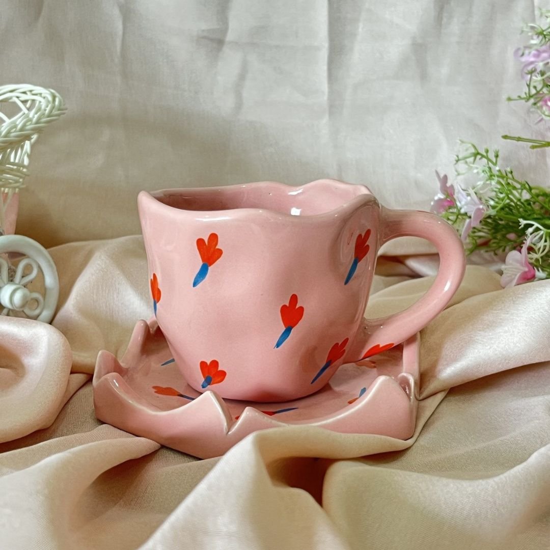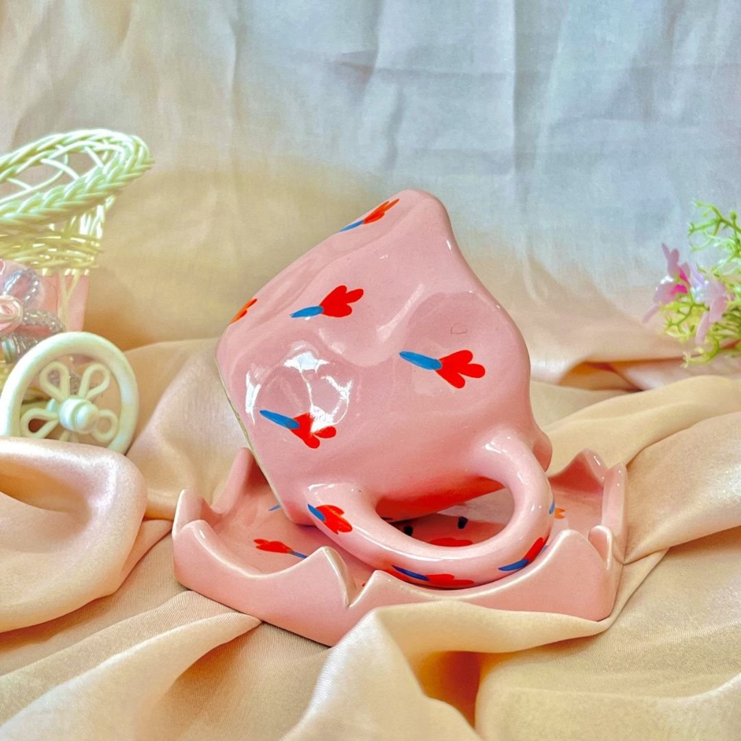 Bring a touch of playful charm to your tea time with the Sweetheart Sip Set. Handcrafted in a soft pastel pink, this uniquely shaped ceramic mug features delightful red and blue floral accents that pop with personality. The matching saucer adds an artistic flair with its wavy, sculpted design—perfect for catching drips while doubling as a decorative statement. Whether you’re sipping your morning coffee or enjoying an evening tea, this quirky yet elegant set transforms every sip into a joyful moment.