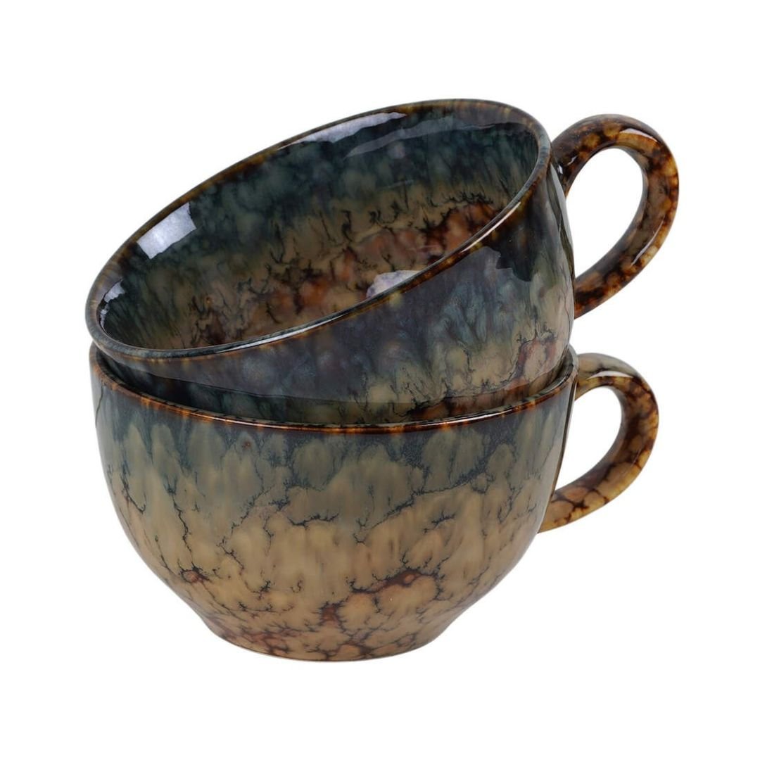 Pair these richly glazed, earthy-toned mugs with a wooden or slate serving tray for a cozy, rustic table setting. Complement with linen napkins in neutral tones (like taupe or olive) and stoneware or matte-finished cutlery to enhance the handcrafted, artisanal charm. Ideal for hearty soups, stews, or even a rustic cappuccino presentation, they also work beautifully as part of an open kitchen shelf display to add warmth and texture.