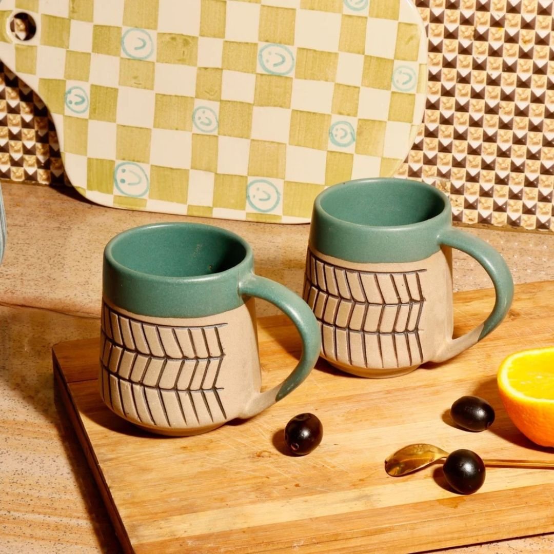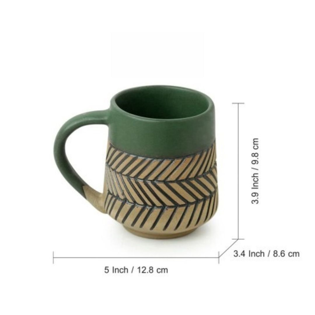 Sip in style with our Verdant Weave Handmade Ceramic Mug, a stunning fusion of earthy tones and artisanal design. Featuring a matte green glazed rim and interior paired with a textured beige body accented by hand-drawn black chevron patterns, this mug brings an artistic flair to your everyday beverage rituals. Crafted by skilled artisans, each mug is unique, showcasing subtle imperfections that highlight its handmade charm. Ideal for hot coffee, tea, or even cocoa, it makes a thoughtful gift or a distinctive addition to your ceramic collection.